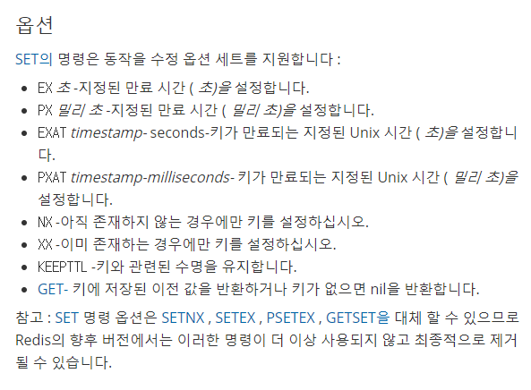 Redis에서 SET을 사용할 때 보통 위에처럼 만 썼다. 대부분에 블로그를 찾아보니 그랬다.