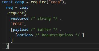 npm에 CoAP이 있고 CoAP Client가 있었는데 둘 다 해본 결과 별 다르지 않다. CoAP은 Listener와 함께 Client에서 사용할 request가 같이 있다. 그래서 멋모르고 그냥 복붙 하면 이해하기 어려울 수 있다.