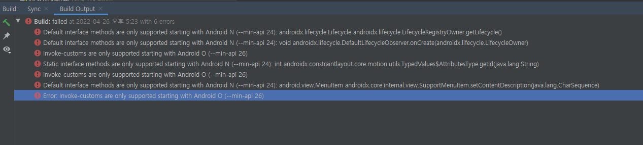 Default interface methods are only supported starting with Android N (--min-api 24): androidx.lifecycle.Lifecycle androidx.lifecycle.LifecycleRegistryOwner.getLifecycle()