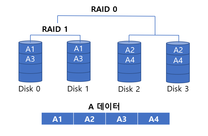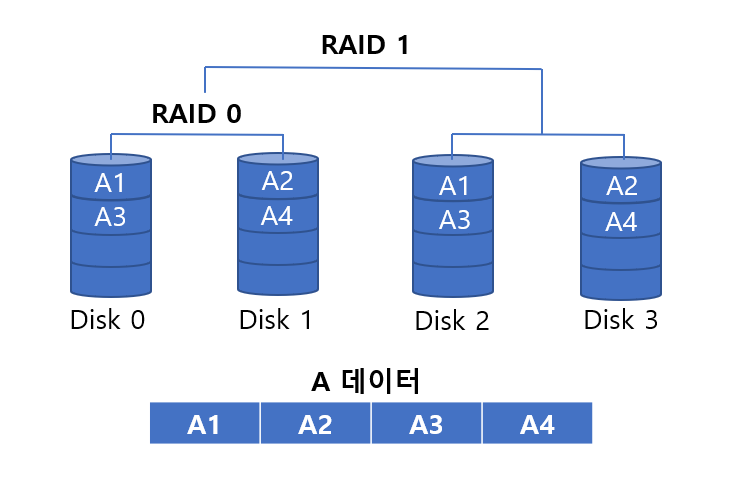 RAID 0로 구성된 하드디스크들을 RAID 1로 미러링 한다. 하드디스크 2개를 RAID 0로 구성 한 후 다른 하드디스크 2개에 RAID 1 미러링을 합니다. 이럴 경우 같은 데이터가 저장된 디스크 0 , 2 또는 디스크 1 , 3 가 같이 고장 또는 다운이 된다면 복구 할 수 없다.