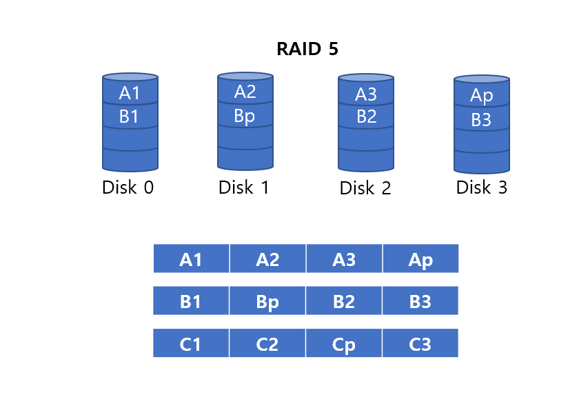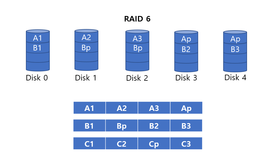 RAID 0처럼 데이터를 블록 단위로 디스크에 저장을 하는데 에러로 인한 손실 방지 패리티가 같이 저장된다, RAID 1처럼 디스크 1개가 고장이나도 고장난 디스크만 교체하면된다. 그런데 디스크가 두 개 이상 고장 나면 데이터가 모두 손실된다. 데이터베이스 서버 등 큰 용량과 무정지 복구 기능을 동시에 필요로 하는 환경에서 주로 쓰인다.