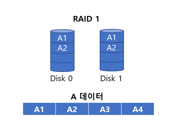 즉 RAID 0에서 성능과 용량을 조금씩 줄이는 대신 안정성을 높인 레벨이라고 볼 수 있다.