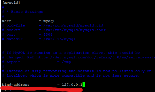 bind-address가 있다. 그걸 0.0.0.0으로 바꿔주자. 그리고 :wq를 입력하고 나오면 된다.